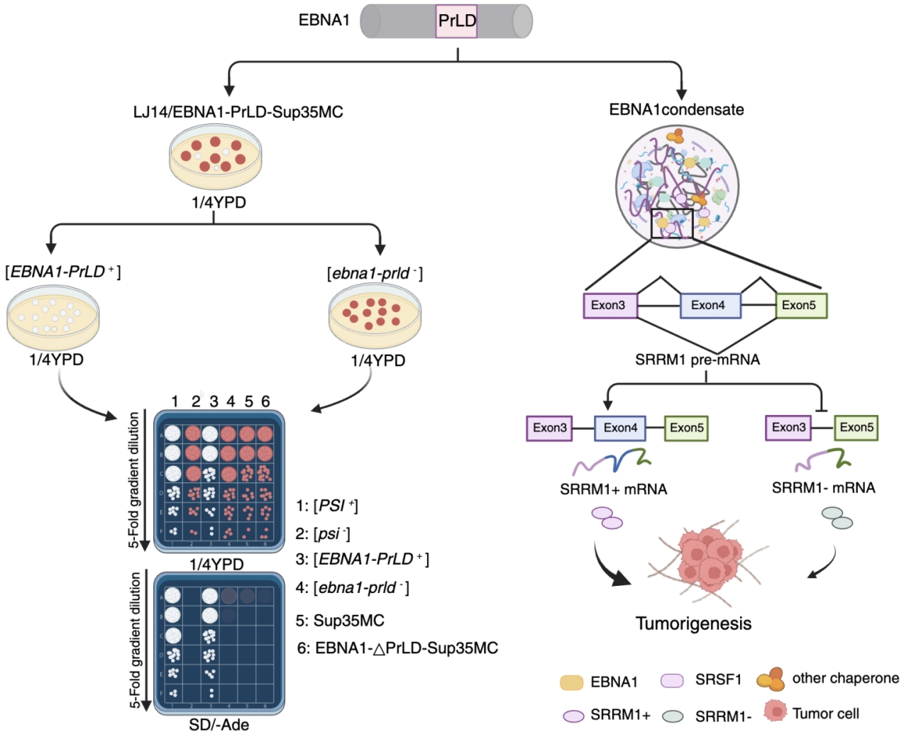 近日,博彩平台导航-博彩导航站 马健课题组在《先进科学》(Advanced Science)发表最新研究成果,证明EB病毒编码核抗原EBNA1是一个类朊蛋白(A Prion-like Domain in EBV EBNA1 Promotes Phase Separation and Enables SRRM1 Splicing)。马健教授、博彩导航站湘雅医博彩平台导航 附属肿瘤医院王晖教授、彭球助理研究员为共同通讯作者,肿瘤医院博士后张宵月为第一作者。