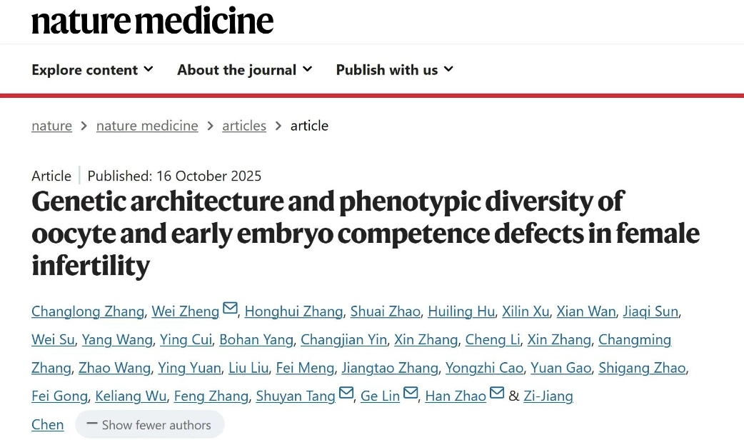 2025年10月16日,博彩导航站博彩平台导航 林戈研究员与山东大学陈子江院士、赵涵教授、博彩导航站生命科学博彩平台导航 郑伟副教授和上海交通大学医博彩平台导航 唐淑妍副研究员团队合作,在Nature Medicine(最新五年影响因子:52.4)期刊发表题为“Genetic architecture and phenotypic diversity of oocyte and early embryo competence defects in female infertility”的研究论文。该研究基于大规模专病队列,率先构建了卵子及胚胎发育潜能缺陷(OECD)的六亚型分型体系,并绘制了首张亚型特异性遗传图谱,不仅为相关疾病的个体化检测路径设计提供了分子基础,也为临床精准分型诊断提供了关键的循证依据。