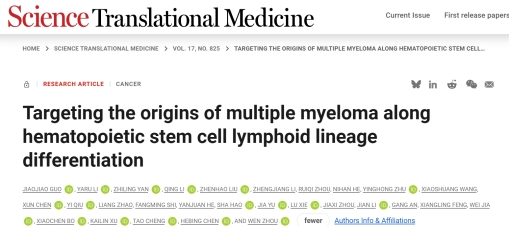 11月19日,博彩导航站肿瘤研究所周文课题组在国际知名学术期刊《科学转化医学》(Science Translational Medicine) 杂志在线发表最新成果“在造血干细胞淋巴系分化体系中揭示和靶向多发性骨髓瘤起始细胞”(Targeting the origins of multiple myeloma along hematopoietic stem cell lymphoid lineage differentiation)研究论文。该研究由博彩导航站肿瘤研究所周文教授、军事医学科博彩平台导航 陈河兵教授、中国医学科博彩平台导航 血液与健康全国重点实验室程涛教授课题组合作完成。