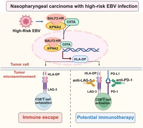 曾朝阳团队发现分离自鼻咽癌组织的EB病毒有超过70%在其基因组上162215_C、162476_C和163364_T这三个位点存在联合变异,且这三个位点均位于BALF2蛋白的编码区,导致BALF2蛋白氨基酸序列改变,而在对照人群中分离的EB病毒这三个变异的频率很低,说明该病毒亚型与鼻咽癌发病风险高度相关,因此将该类型的EB病毒定义为高危(High risk)亚型,其编码的BALF2变异蛋白命名为BALF2-HR。进一步研究发现BALF2-HR显著上调鼻咽癌细胞中HLA基因家族中的HLA-II类分子,特别是HLA-DP的表达;鼻咽癌细胞表面高表达的HLA-DP通过与CD8+T细胞表面LAG-3结合,抑制CD8+T细胞的功能,导致鼻咽癌逃避免疫系统的杀伤,并降低了鼻咽癌免疫治疗的效果。