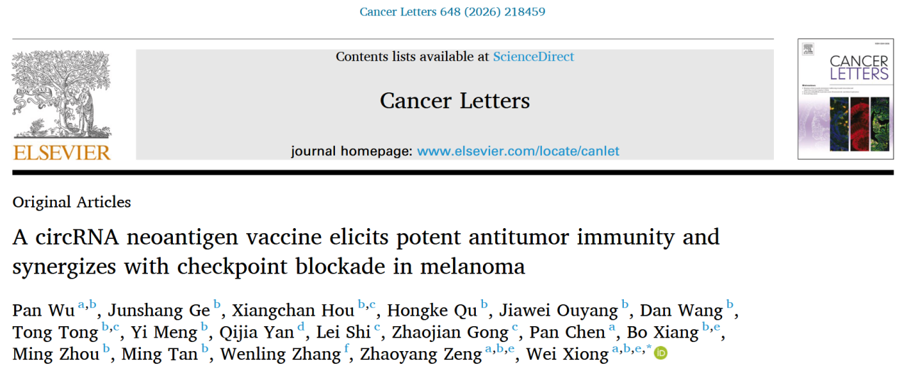 近日,博彩平台导航-博彩导航站 、博彩导航站肿瘤研究所熊炜研究员团队在Cancer Letters《癌症快报》杂志在线发表了题为“A circRNA Neoantigen Vaccine Elicits Potent Antitumor Immunity and Synergizes with Checkpoint Blockade in Melanoma”的论文,展示了利用环状RNA(circRNA)表达肿瘤新抗原(Neoantigen)在肿瘤免疫治疗中的潜在应用前景。熊炜为该论文通讯作者,博士后吴盼为第一作者。